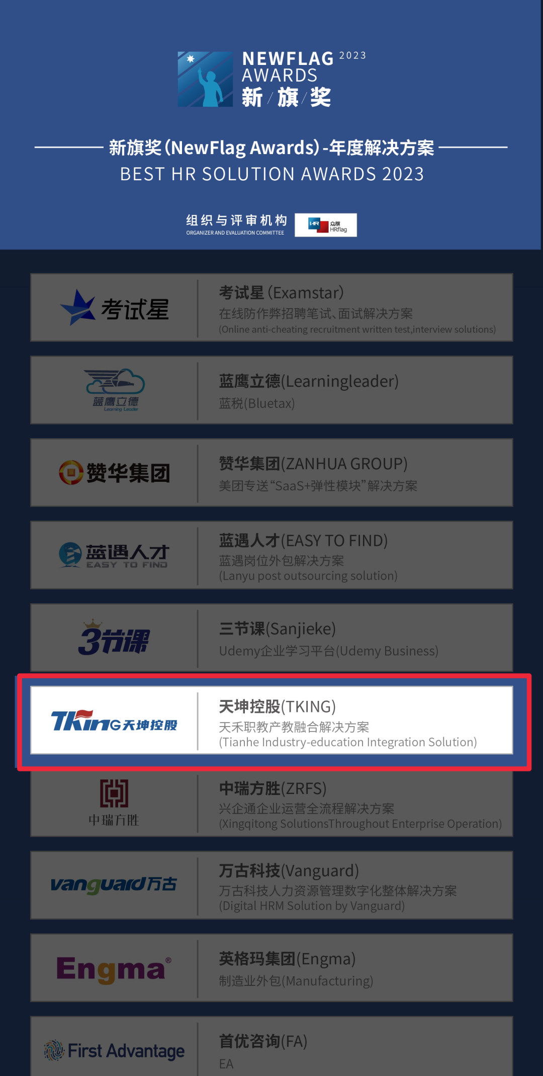 2022年12月30日,由HRflag举办的2023“新旗奖”(NewFlag Awards) 人力资源服务业创新竞赛揭晓结果,天坤控股集团凭借“天禾职教产教融合解决方案”摘得“2023解决方案大奖”。