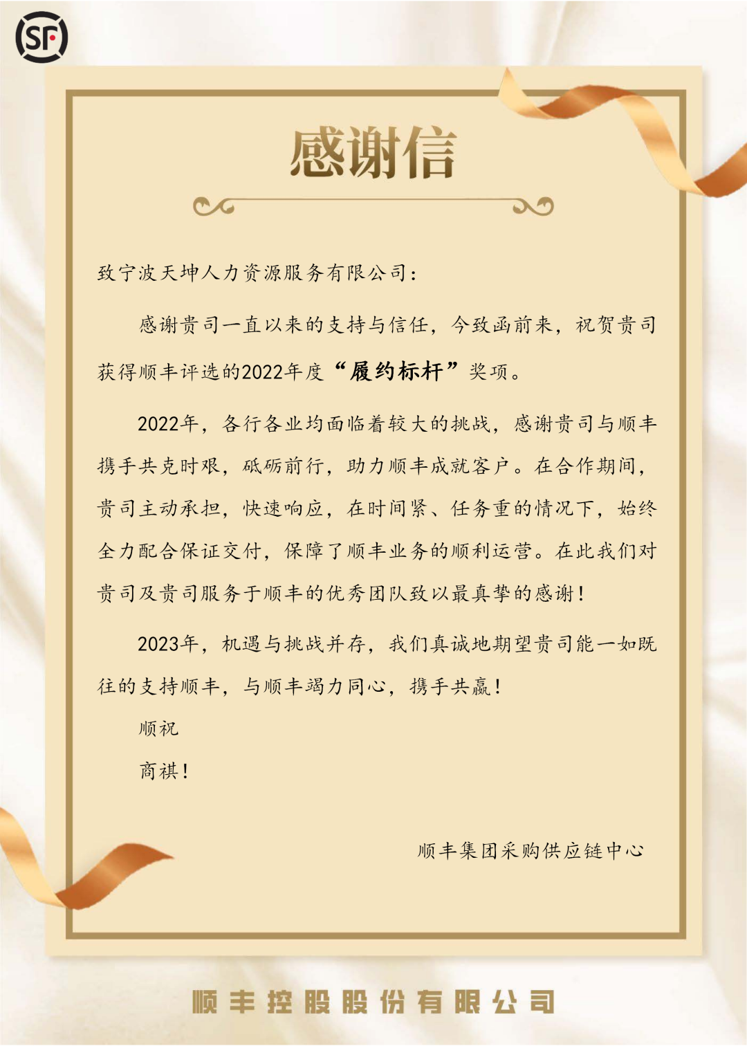 在感谢信中,顺丰集团表示,2022年,各行各业均面临着较大的挑战,感谢天坤与顺丰携手共克时艰,砥砺前行,助力顺丰成就客户。在合作期间,天坤主动承担,快速响应,在时间紧、任务重的情况下,始终全力配合保证交付,保障了顺丰业务的顺利运营。